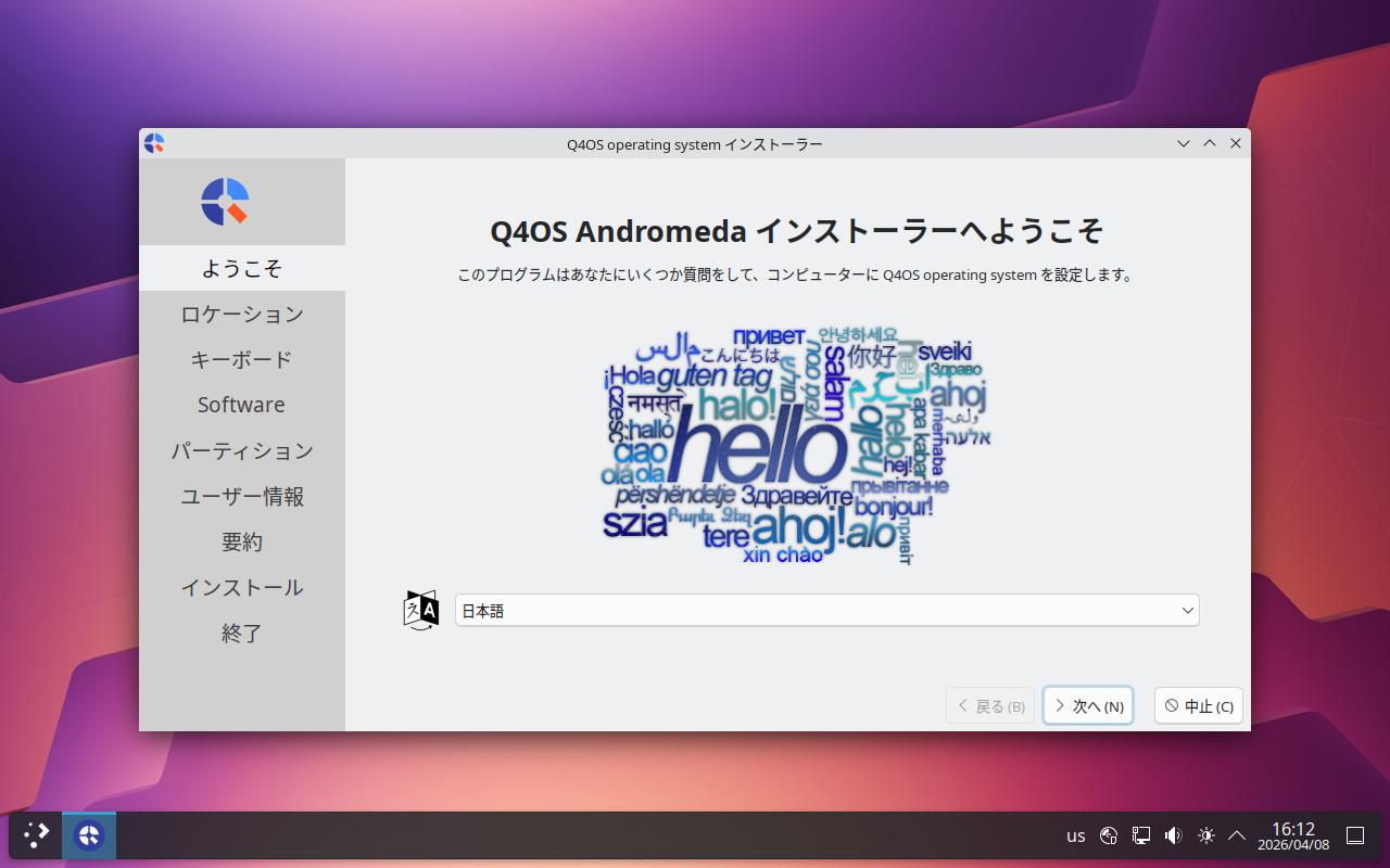デスクトップにある Install Q4OS を起動します。