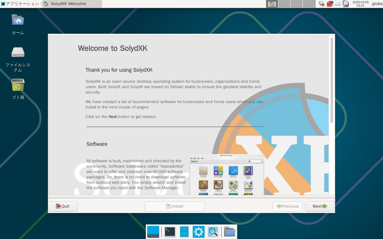 Debian 派生。XFCE の SolydX と KDE の SolydK があります。
